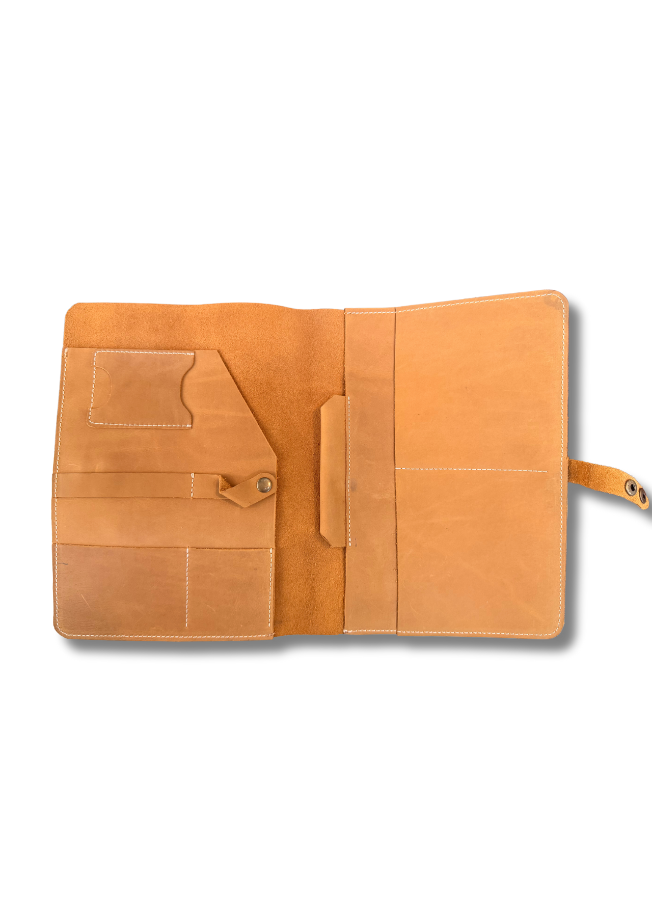 This finely crafted organizer is made from smooth, natural tan genuine leather, showcasing its raw beauty both inside and out. The interior layout is thoughtfully designed: on the left side you have multiple card and document slots, a larger lower pocket, and a flap compartment secured with a brass snap tab for items you want to keep extra safe. The center features a leather pen loop so you always have a pen or stylus ready, while the right side offers a full-height sleeve perfect for a notebook, tablet, or important papers. Clean contrast stitching frames every panel and pocket, highlighting the precision of the hand-finishing and reinforcing stress points for long-lasting durability. The soft suede-like inner surface is the natural underside of the leather, which protects your items from scratches and will develop a rich patina with use, making this piece more personal over time.