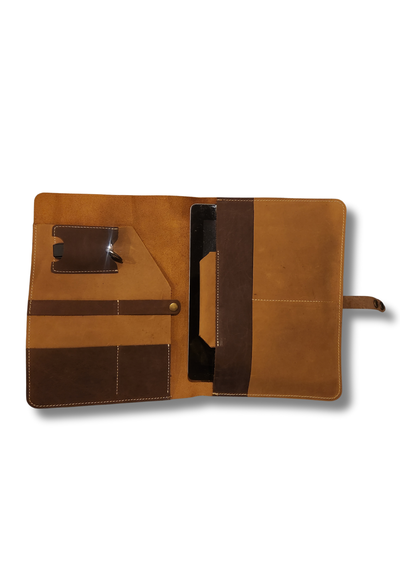 This pure genuine leather iPad cover is masterfully crafted to combine protection, convenience, and timeless elegance. Designed with meticulous attention to detail, it features a structured, padded compartment that securely holds your iPad in place, ensuring both safety and easy access. The smooth, full-grain leather exterior provides exceptional durability, while its natural texture enhances grip and comfort during everyday use.