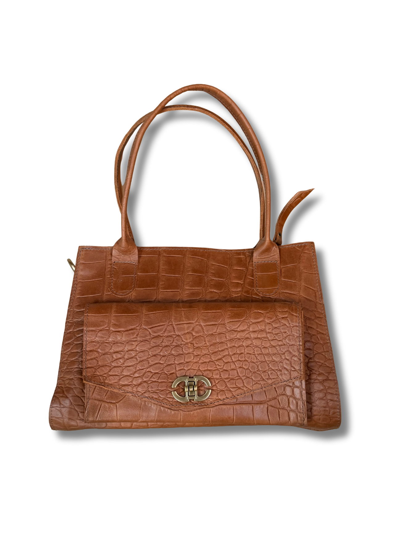 This structured tote is crafted from genuine leather with a rich tan finish and an all-over crocodile-embossed texture that immediately stands out. The body of the bag has a softly structured rectangular shape, designed to hold its form while still feeling supple in the hand. A generous front flap pocket mirrors the croc embossing and is finished with an elegant gold-tone twist-lock clasp, adding both security and a touch of luxury. Double rolled handles are cut from the same leather and stitched cleanly into reinforced tabs, giving a comfortable grip and long-term durability. The proportions make this bag ideal for daily use, with enough space for a tablet, wallet, phone, cosmetics, and small extras without looking bulky. Meticulous stitching along the edges and seams highlights the craftsmanship behind this piece, ensuring it wears beautifully over time and develops a unique patina that only real leather can offer.